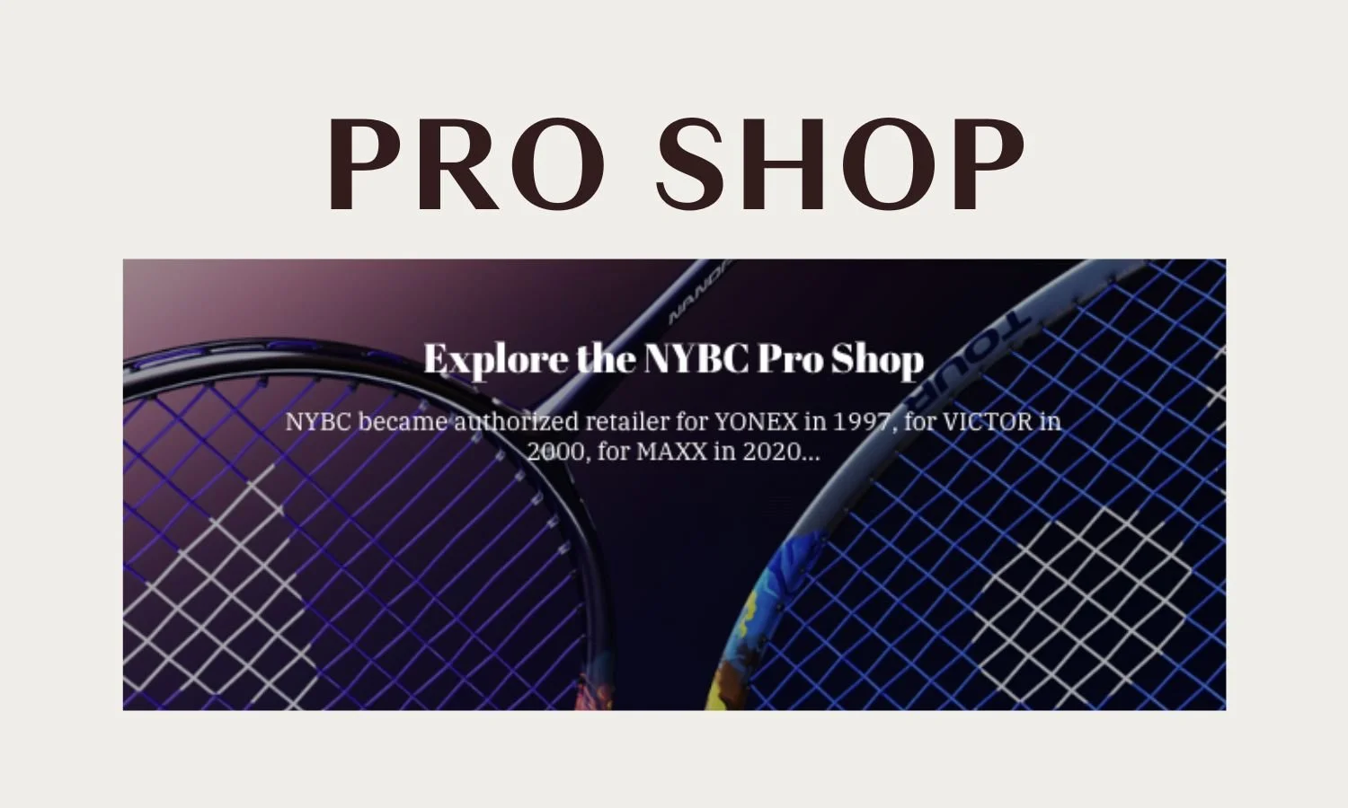 We carry all YONEX merchants here at NYBC. You can actually see and feel the raquets, tryon the shoes, chose and match the grips and socks.