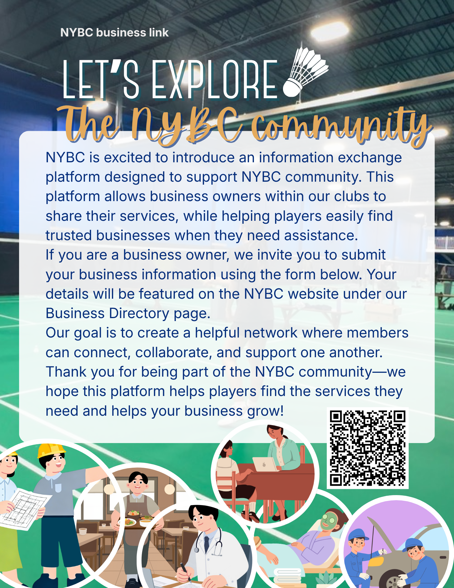 NYBC is excited to introduce an information exchange platform designed to support NYBC community. This platform allows business owners within our clubs to share their services, while helping players easily find trusted businesses when they need assistance.