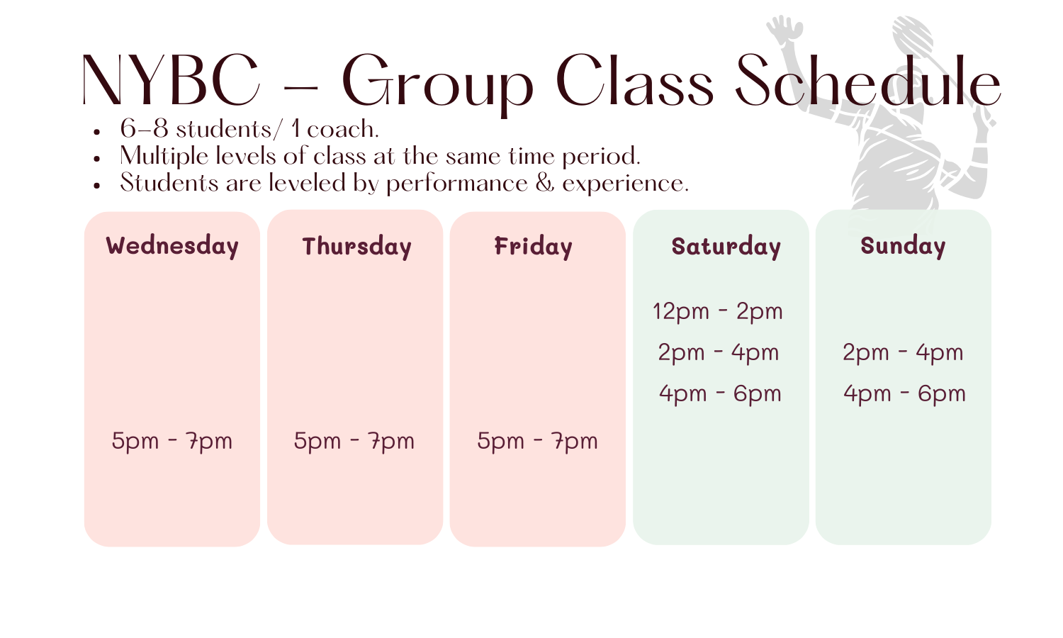 Refund requests will be considered only for verified medical issues or relocation at least 25 miles from NYBC. Proof of the situation may be required. Classes already attended will be charged at $70 per class, plus a $40 admission fee per student.